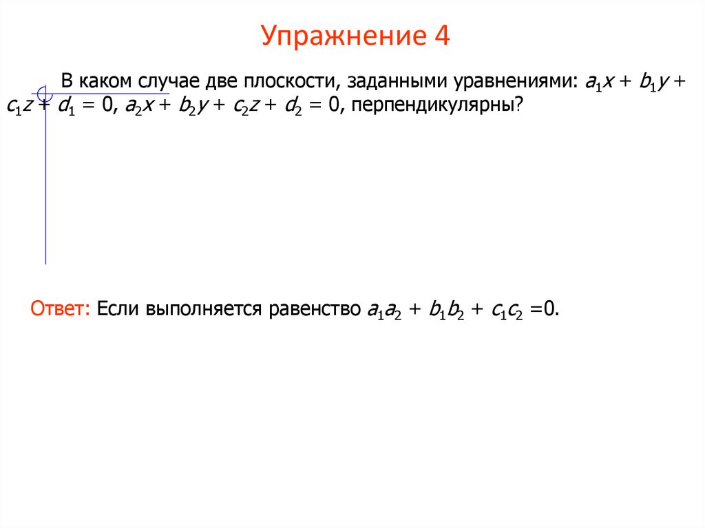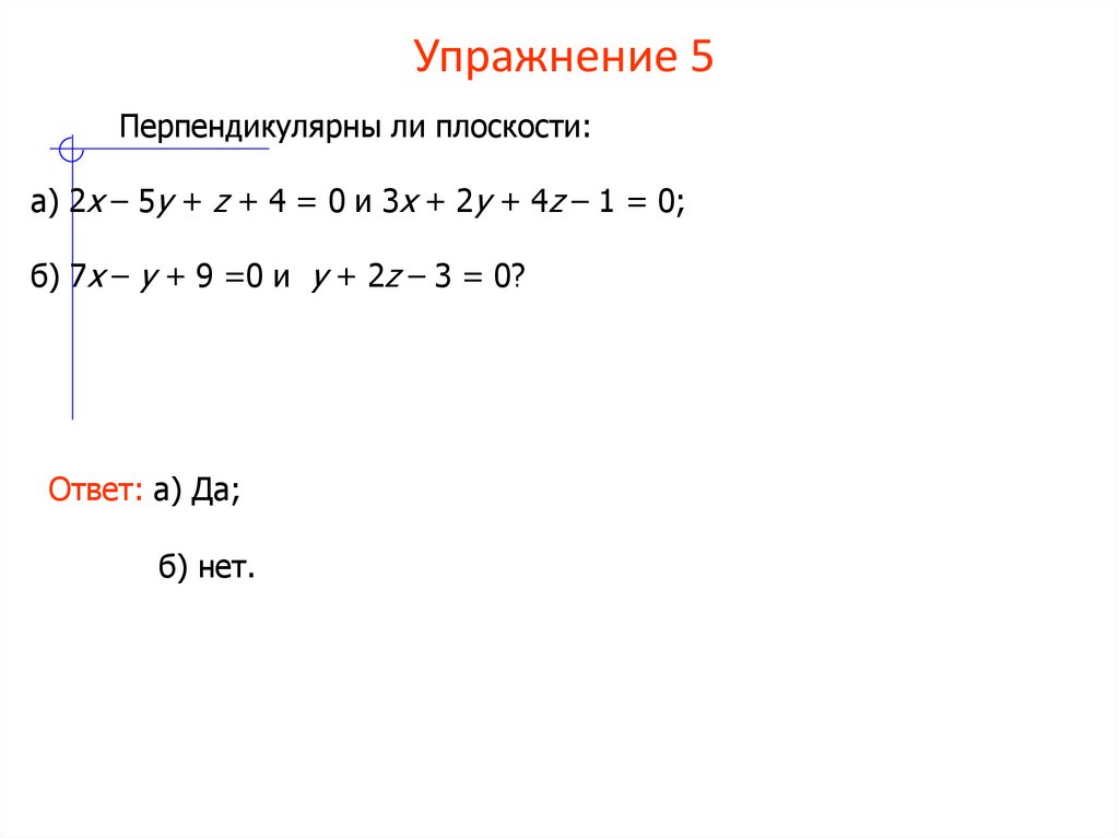 Перпендикулярны ли плоскости:а) 2x – 5y + z + 4 = 0 и 3x + 2y + 4z – 1 = 0;