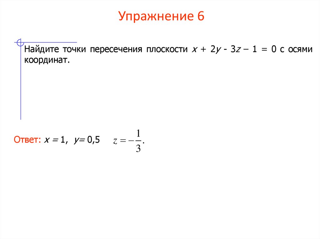 Найдите точки пересечения плоскости x + 2y - 3z – 1 = 0 с осямикоординат.