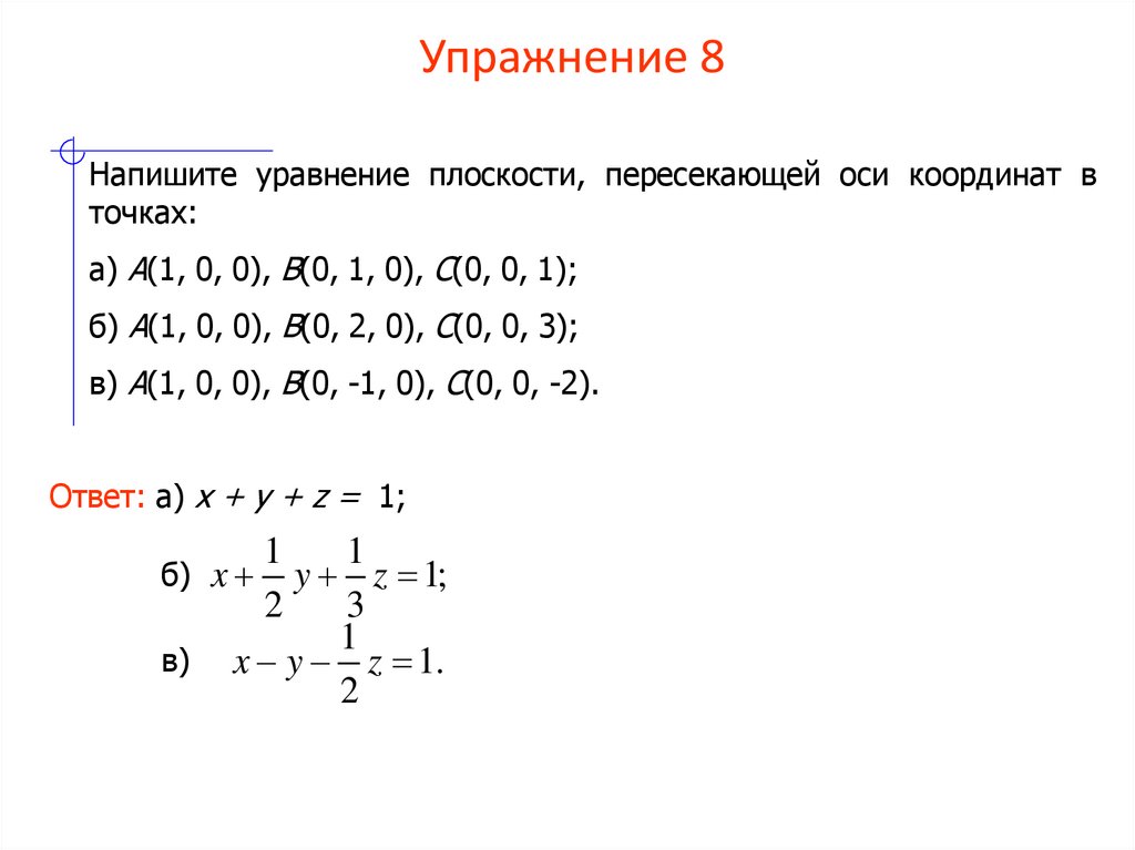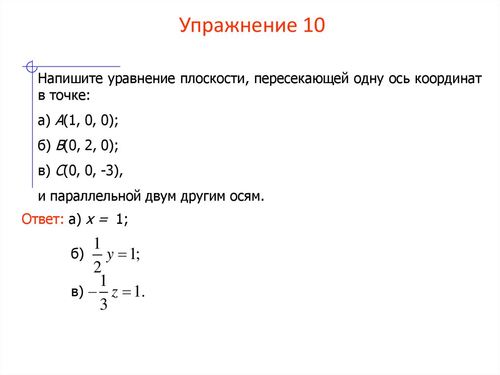 Напишите уравнение плоскости, пересекающей одну ось координатв точке: