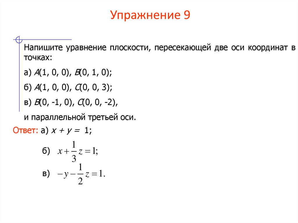 Напишите уравнение плоскости, пересекающей две оси координат вточках: