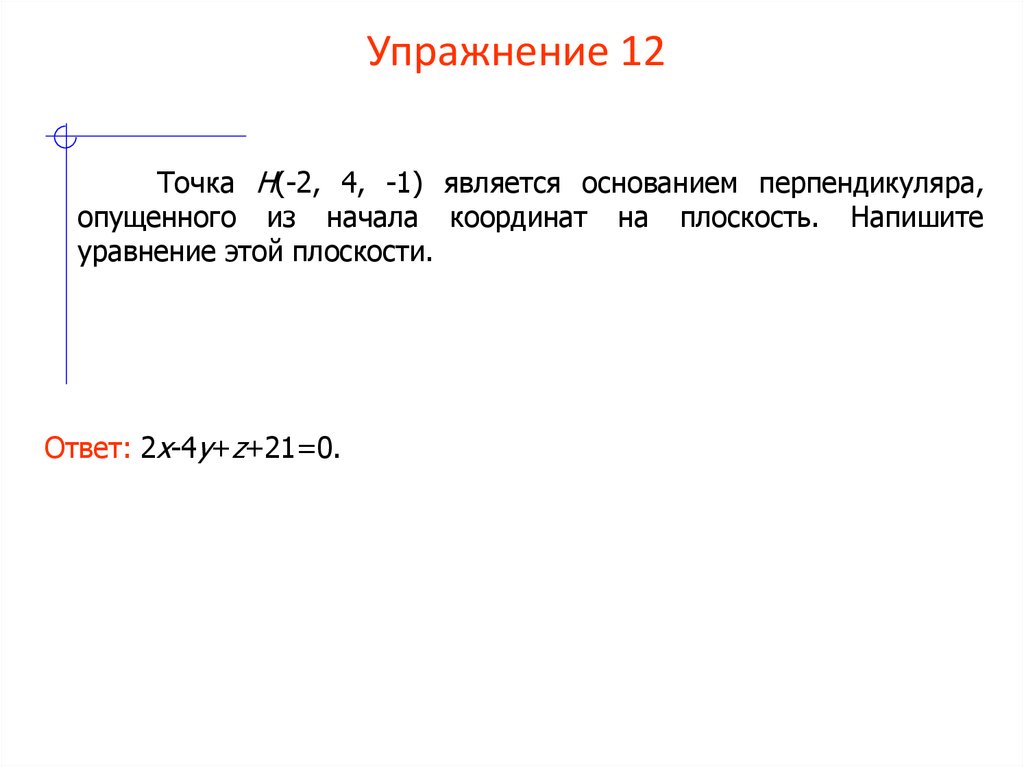 Точка H(-2, 4, -1) является основанием перпендикуляра,опущенного из начала координат на плоскость. Напишите