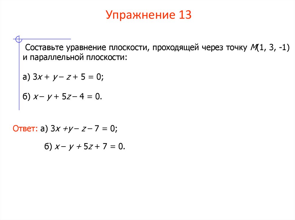 Составьте уравнение плоскости, проходящей через точку M(1, 3, -1)и параллельной плоскости: