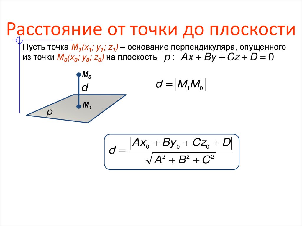 Пусть точка М1(x1; y1; z1) – основание перпендикуляра, опущенногоиз точки М0(x0; y0; z0) на плоскость p : Ax By Cz D 0
