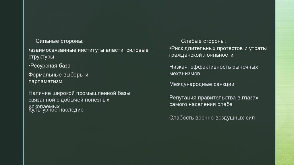 Сильные стороны:•взаимосвязанные институты власти, силовые