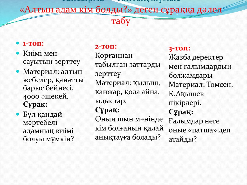 18. Тапсырма Топтық жұмыс «Алтын адам кім болды?» деген сұраққа дәлел табу