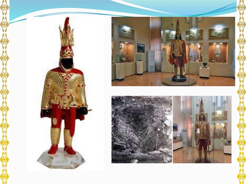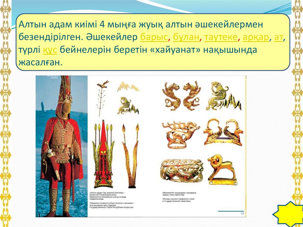 10. Алтын адам киімі 4 мыңға жуық алтын әшекейлермен безендірілген. Әшекейлер барыс, бұлан, таутеке, арқар, ат,