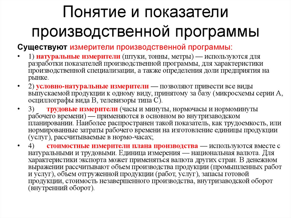 Существуют измерители производственной программы:1) натуральные измерители (штуки, тонны, метры) — используются для