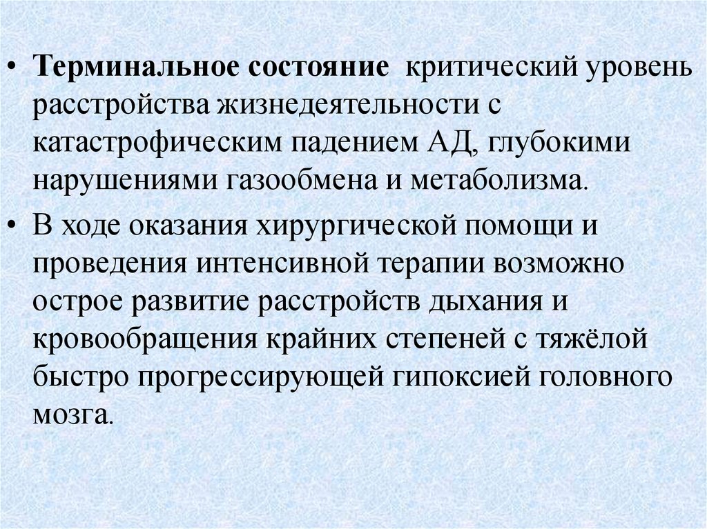 • Терминальное состояние критический уровеньрасстройства жизнедеятельности с