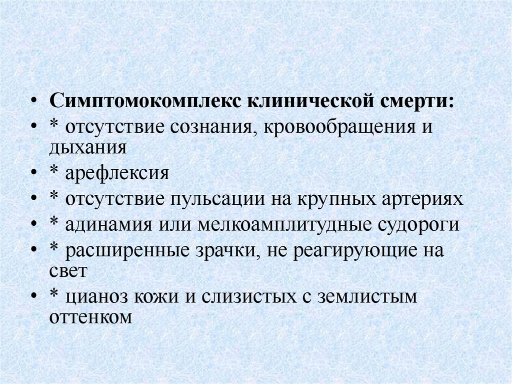 • Симптомокомплекс клинической смерти:• * отсутствие сознания, кровообращения и