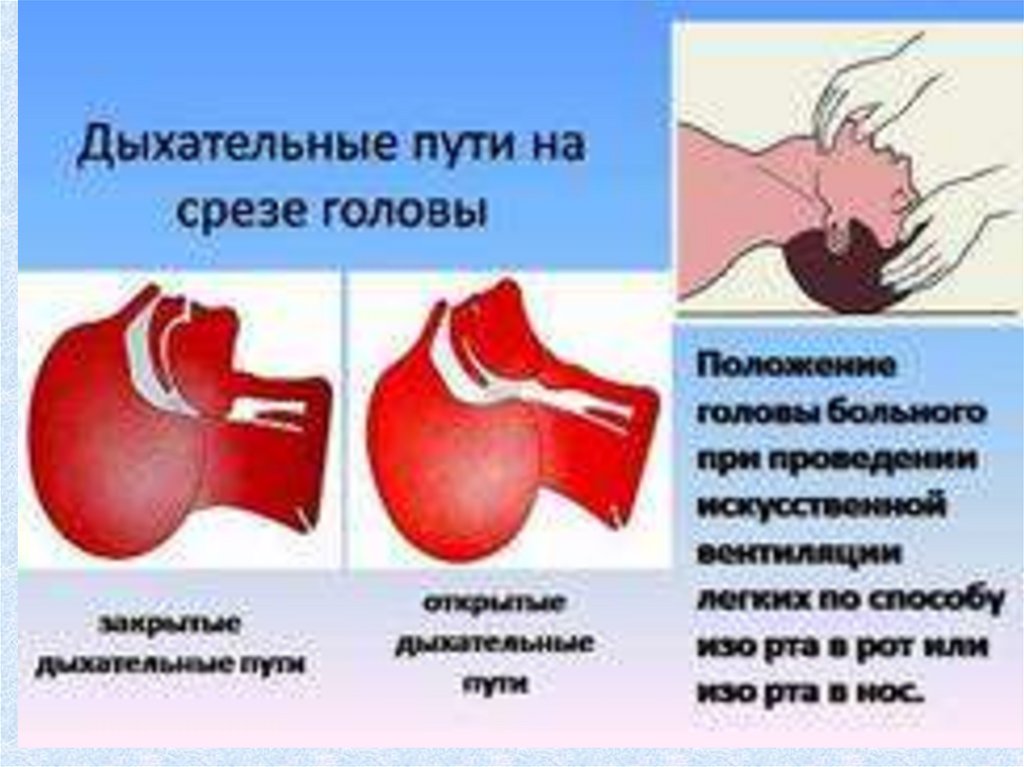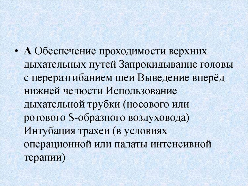 • А Обеспечение проходимости верхнихдыхательных путей Запрокидывание головы