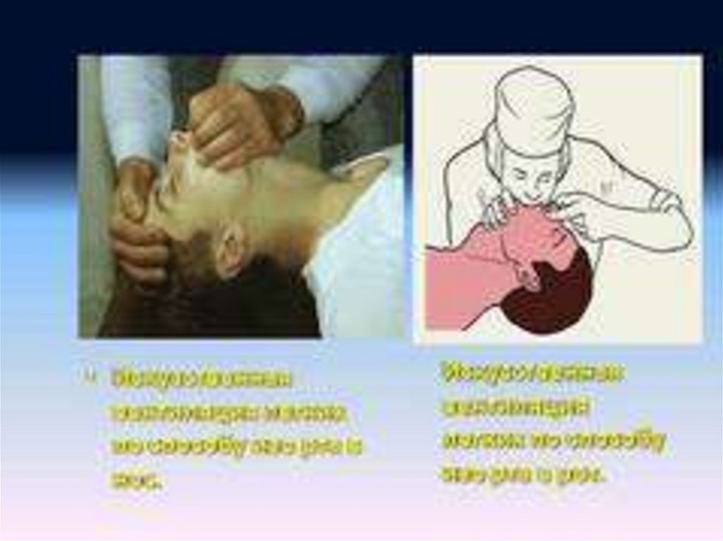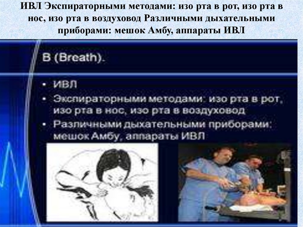 18. ИВЛ Экспираторными методами: изо рта в рот, изо рта в нос, изо рта в воздуховод Различными дыхательными приборами: мешок Амбу,