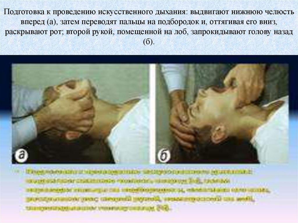 аппараты ИВЛ19. Подготовка к проведению искусственного дыхания: выдвигают нижнюю челюсть вперед (а), затем переводят пальцы на подбородок и,