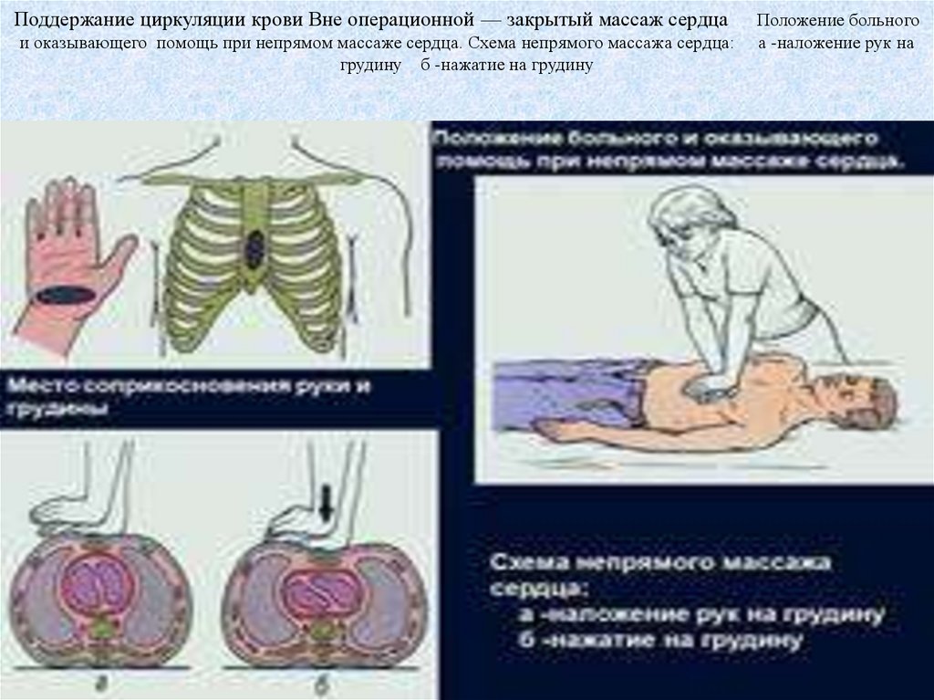 Поддержание циркуляции крови Вне операционной — закрытый массаж сердцаи оказывающего помощь при непрямом массаже сердца. Схема непрямого массажа сердца: