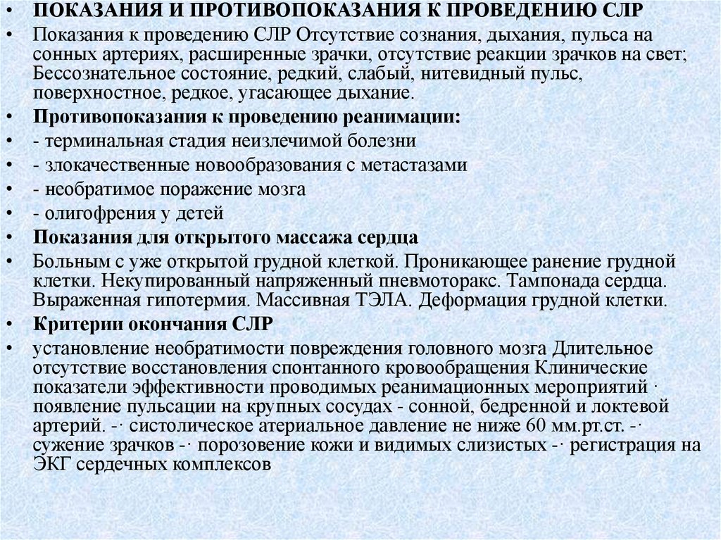 • ПОКАЗАНИЯ И ПРОТИВОПОКАЗАНИЯ К ПРОВЕДЕНИЮ СЛР• Показания к проведению СЛР Отсутствие сознания, дыхания, пульса на
