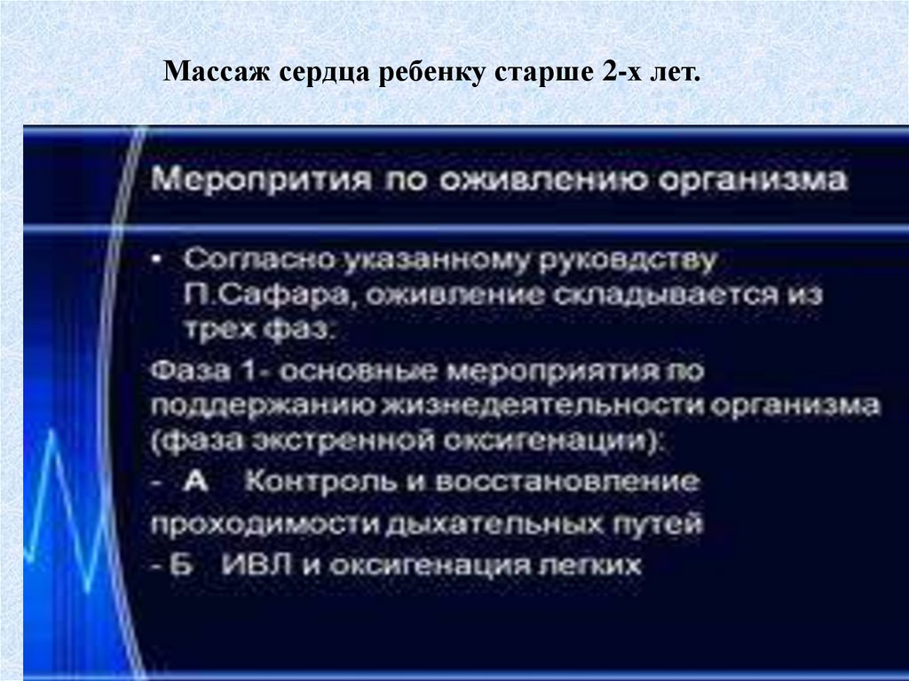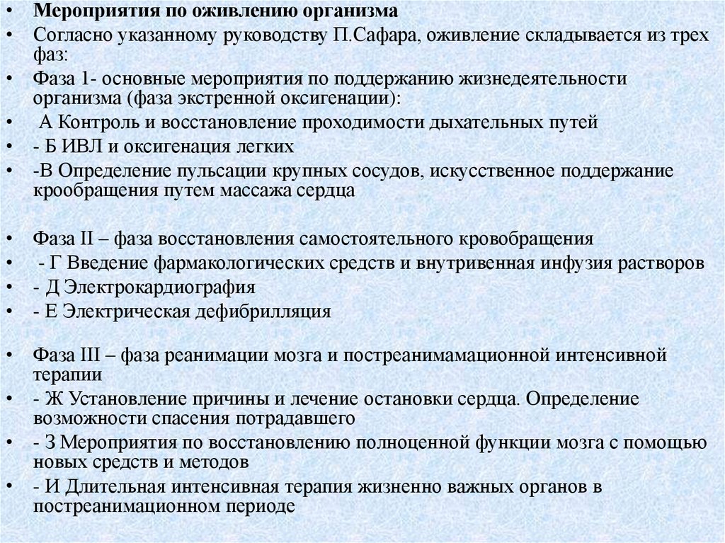 • Мероприятия по оживлению организма• Согласно указанному руководству П.Сафара, оживление складывается из трех