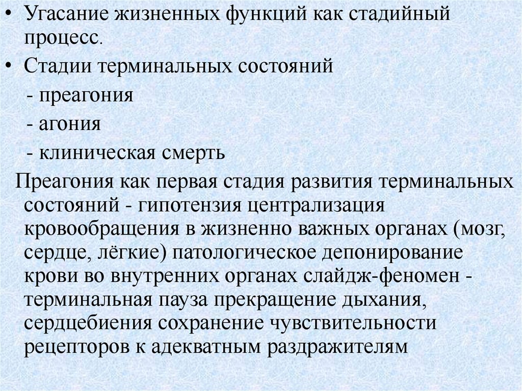 • Угасание жизненных функций как стадийныйпроцесс.
