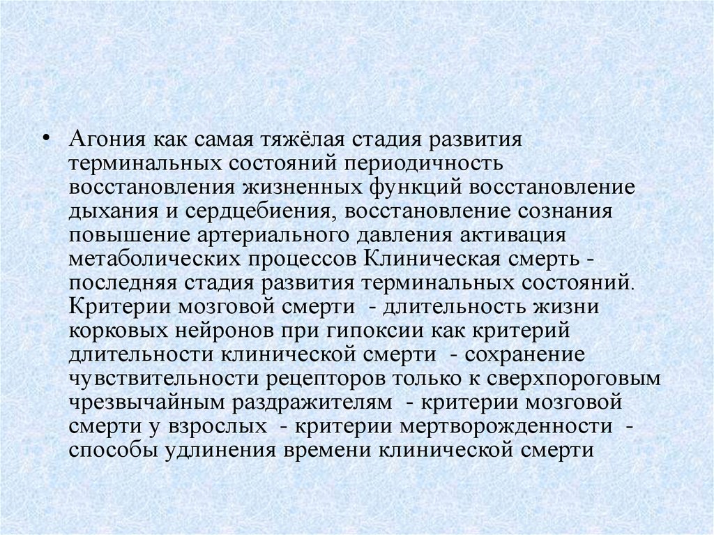 • Агония как самая тяжёлая стадия развитиятерминальных состояний периодичность