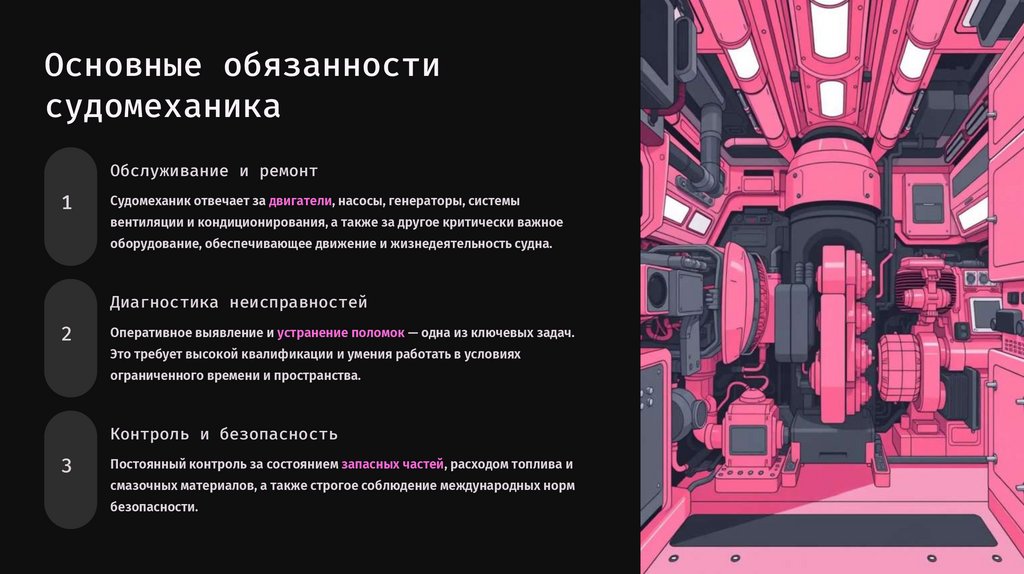Судомеханик отвечает за двигатели, насосы, генераторы, системы