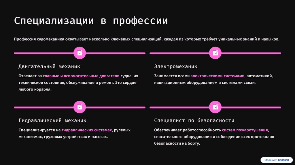 Специализации в профессииПрофессия судомеханика охватывает несколько ключевых специализаций, каждая из которых требует уникальных знаний и навыков.