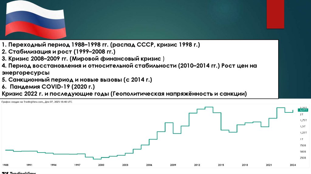 1. Переходный период 1988–1998 гг. (распад СССР, кризис 1998 г.)2. Стабилизация и рост (1999–2008 гг.)