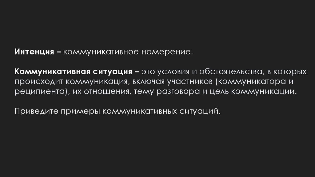Интенция – коммуникативное намерение.Коммуникативная ситуация – это условия и обстоятельства, в которых
