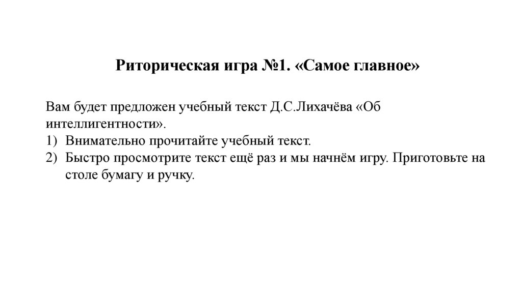 Риторическая игра №1. «Самое главное»Вам будет предложен учебный текст Д.С.Лихачёва «Об