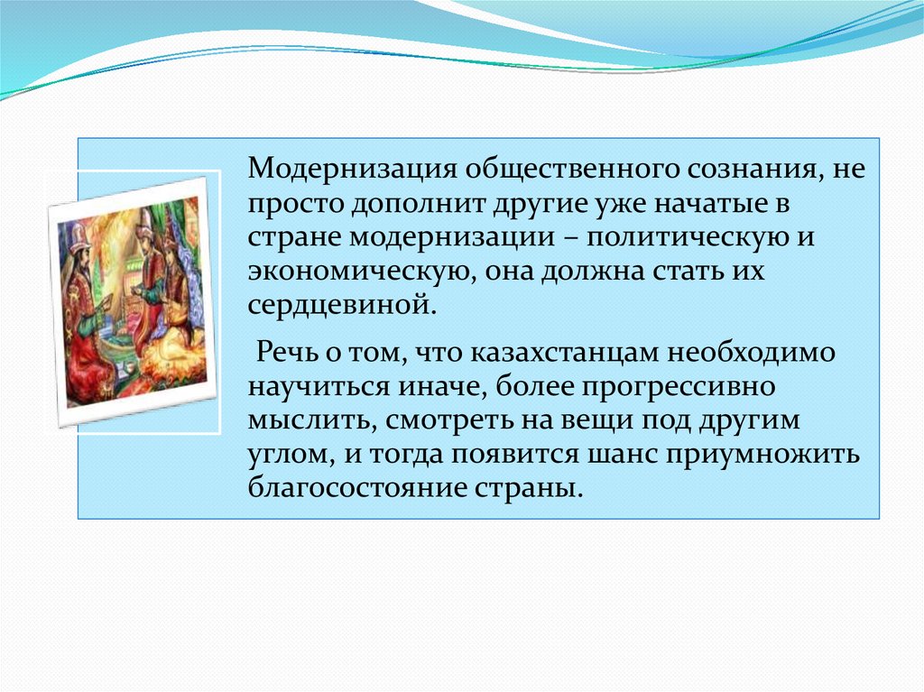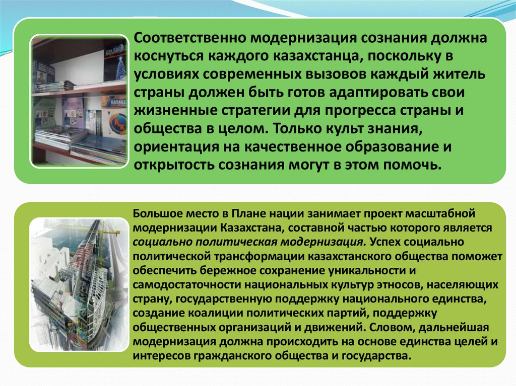 Соответственно модернизация сознания должнакоснуться каждого казахстанца, поскольку в