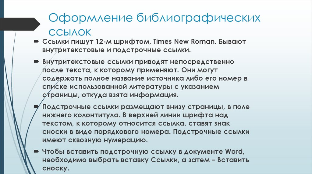 Ссылки пишут 12-м шрифтом, Тimes New Roman. Бываютвнутритекстовые и подстрочные ссылки.