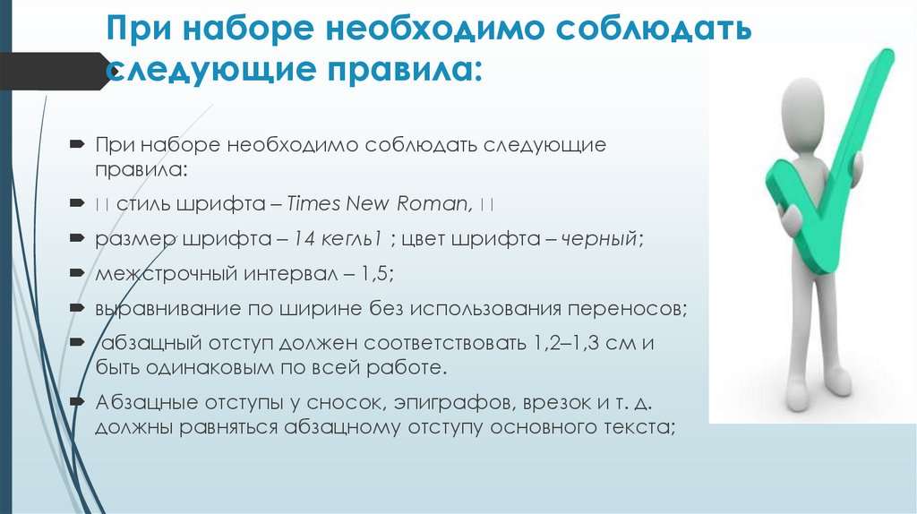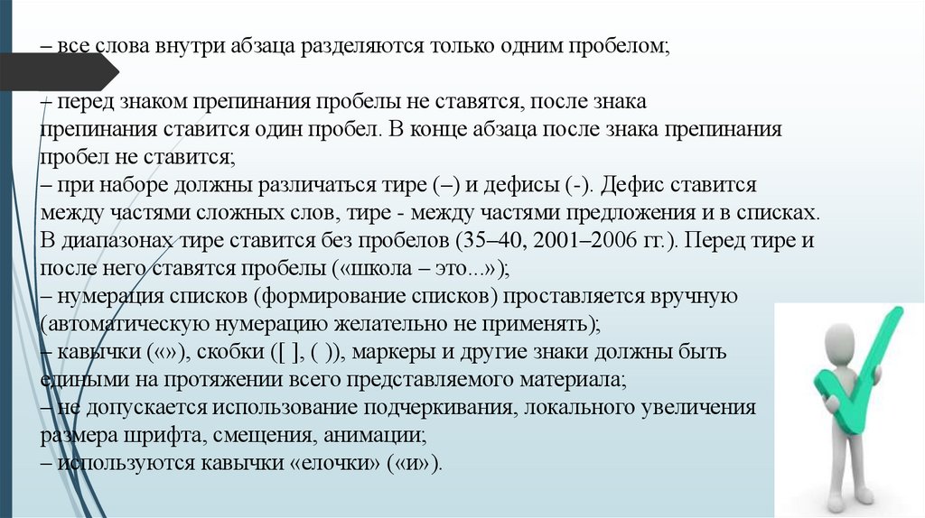 – все слова внутри абзаца разделяются только одним пробелом;– перед знаком препинания пробелы не ставятся, после знака