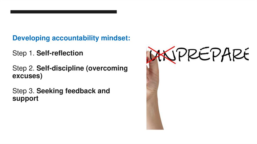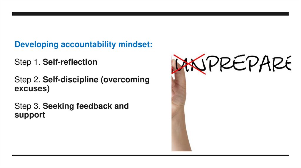 22. Developing accountability mindset: Step 1. Self-reflection Step 2. Self-discipline (overcoming excuses) Step 3. Seeking