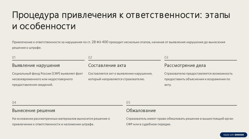 Привлечение к ответственности за нарушения по ст. 28 ФЗ-400 проходит несколько этапов, начиная от выявления нарушения до вынесения