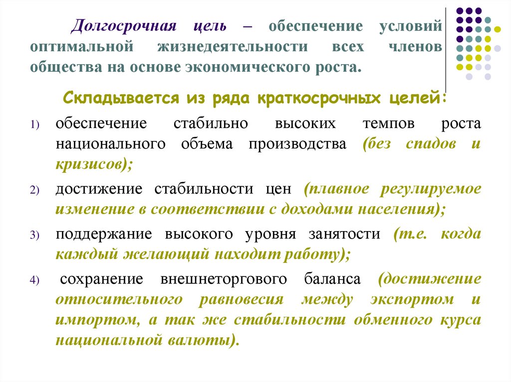 3. Долгосрочная цель – обеспечение условий оптимальной жизнедеятельности всех членов общества на основе экономического роста.