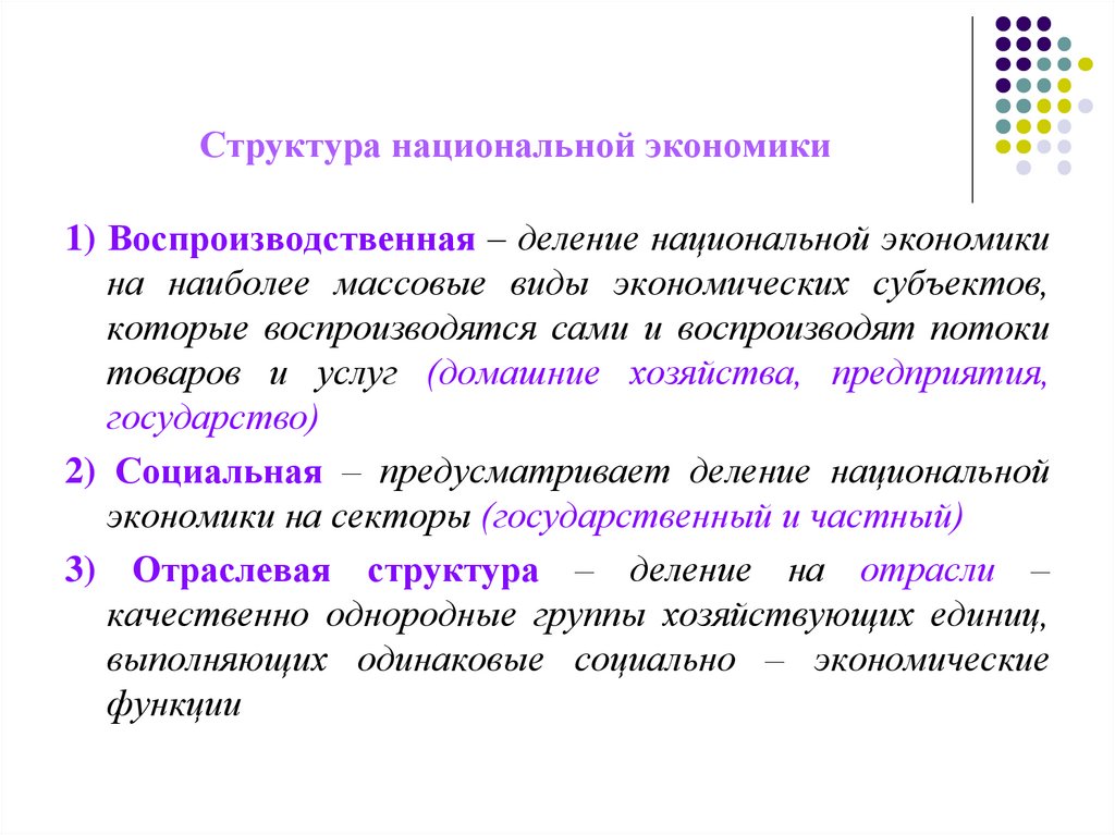 1) Воспроизводственная – деление национальной экономикина наиболее массовые виды экономических субъектов,