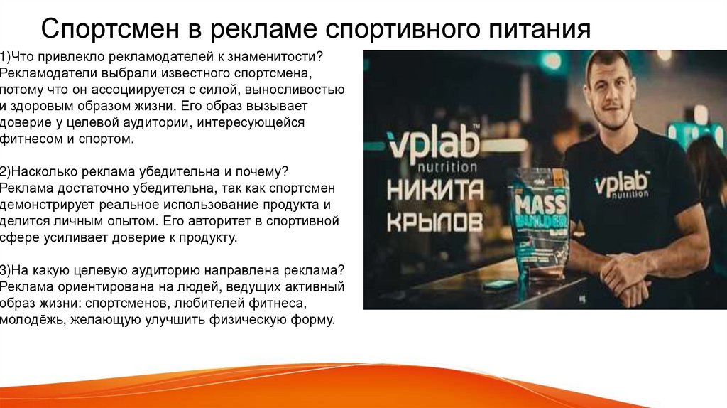 Спортсмен в рекламе спортивного питания1)Что привлекло рекламодателей к знаменитости?