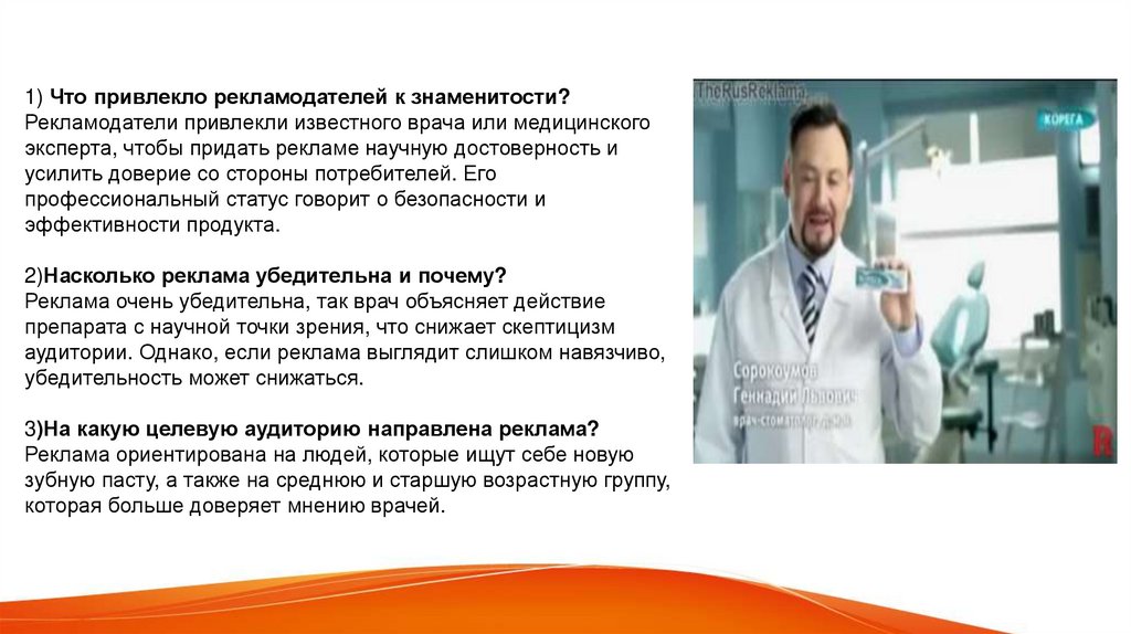 1) Что привлекло рекламодателей к знаменитости?Рекламодатели привлекли известного врача или медицинского