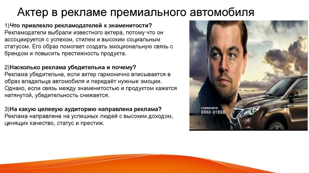 Актер в рекламе премиального автомобиля1)Что привлекло рекламодателей к знаменитости?