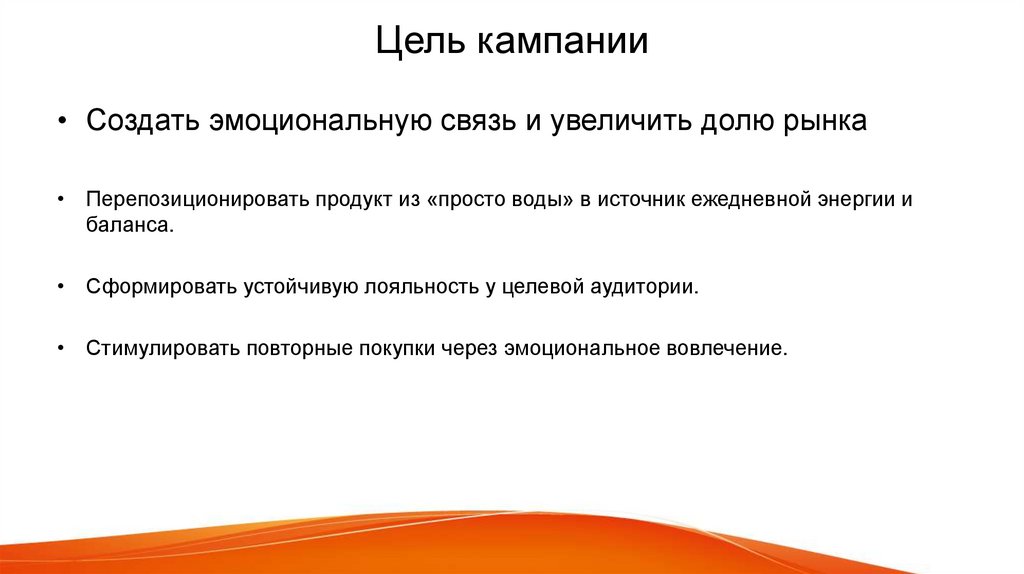 • Перепозиционировать продукт из «просто воды» в источник ежедневной энергии и