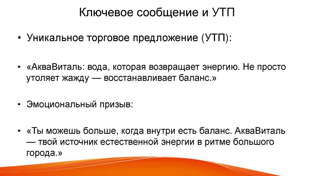 Ключевое сообщение и УТП• Уникальное торговое предложение (УТП):