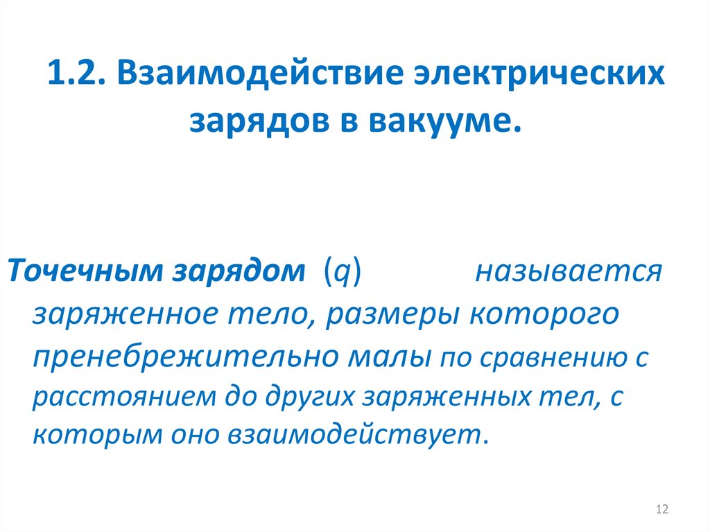 12. 1.2. Взаимодействие электрических зарядов в вакууме.