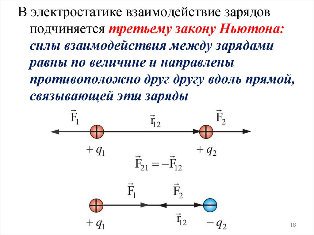 В электростатике взаимодействие зарядовподчиняется третьему закону Ньютона: