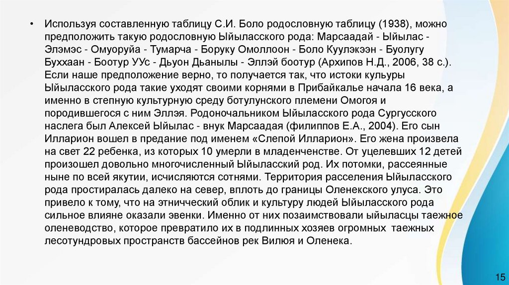 • Используя составленную таблицу С.И. Боло родословную таблицу (1938), можнопредположить такую родословную Ыйыласского рода: Марсаадай - Ыйылас Элэмэс - Омуоруйа - Тумарча - Боруку Омоллоон - Боло Куулэкээн - Буолугу