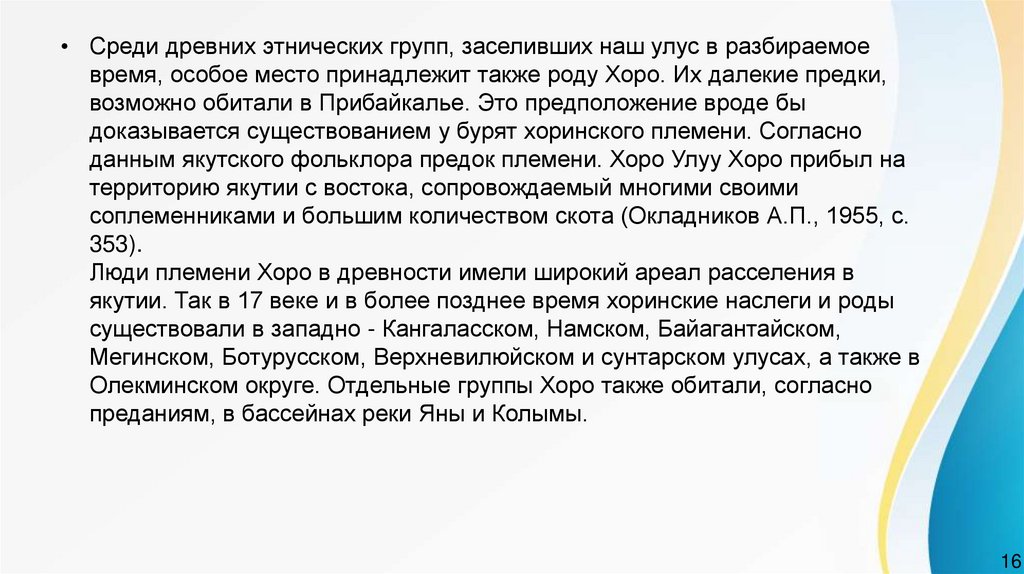 • Среди древних этнических групп, заселивших наш улус в разбираемоевремя, особое место принадлежит также роду Хоро. Их далекие предки,
