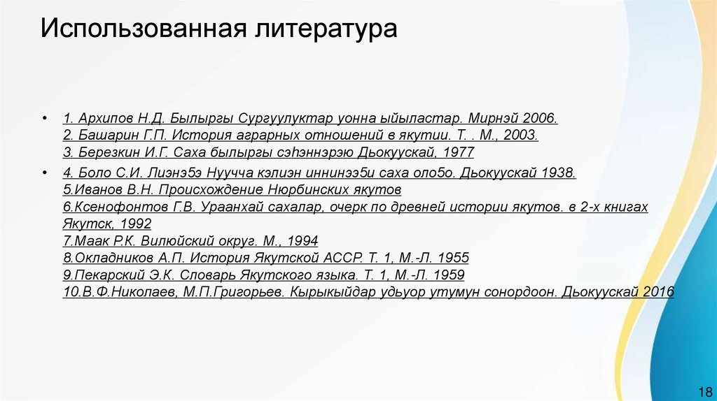 Использованная литература1. Архипов Н.Д. Былыргы Сургуулуктар уонна ыйыластар. Мирнэй 2006.