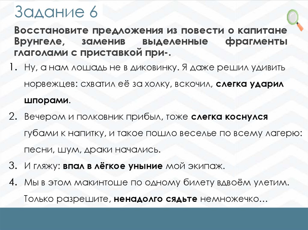 Задание 6Восстановите предложения из повести о капитане