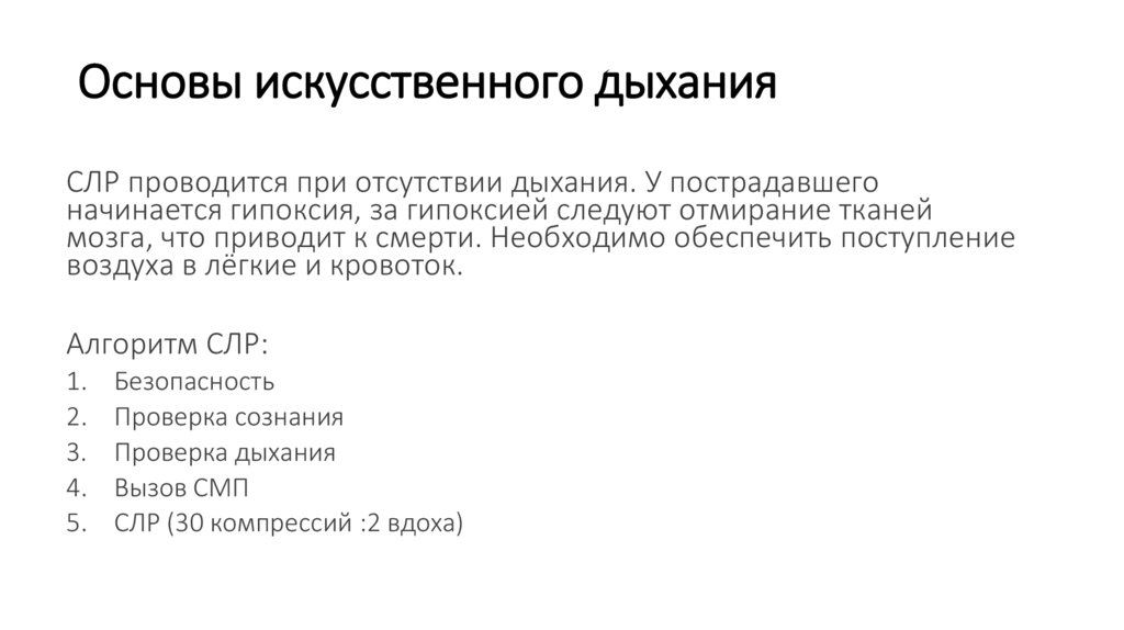 Основы искусственного дыханияСЛР проводится при отсутствии дыхания. У пострадавшего
