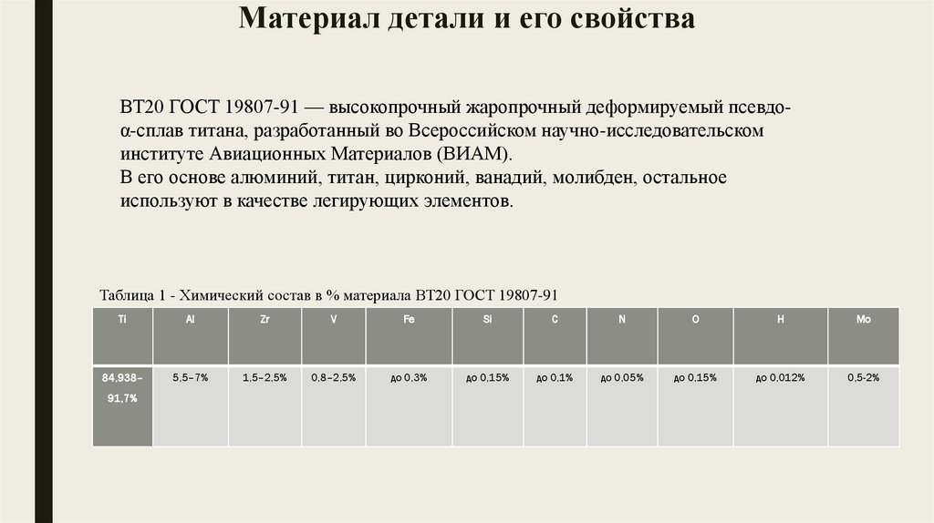 Таблица 1 - Химический состав в % материала ВТ20 ГОСТ 19807-91