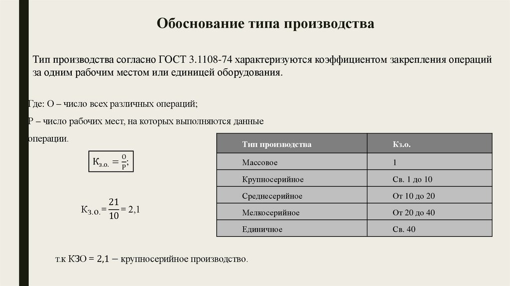 Тип производства согласно ГОСТ 3.1108-74 характеризуются коэффициентом закрепления операцийза одним рабочим местом или единицей оборудования.