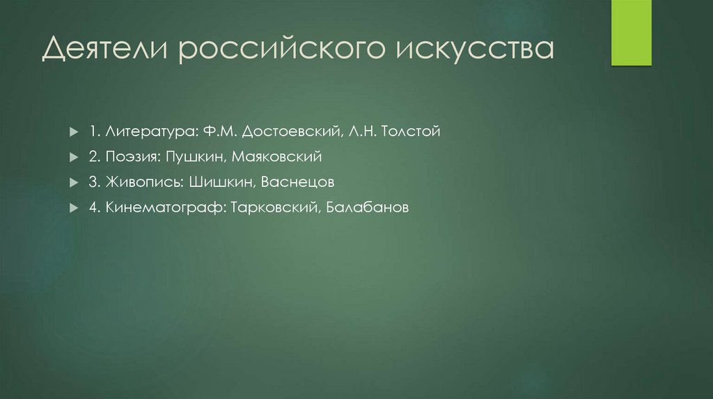 1. Литература: Ф.М. Достоевский, Л.Н. Толстой2. Поэзия: Пушкин, Маяковский