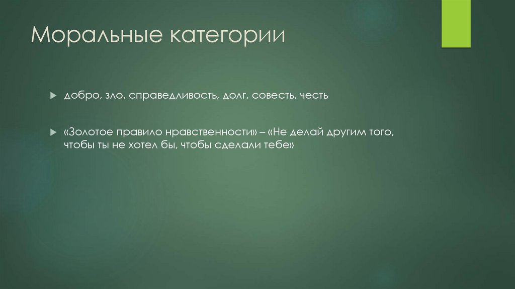 добро, зло, справедливость, долг, совесть, честь«Золотое правило нравственности» – «Не делай другим того,
