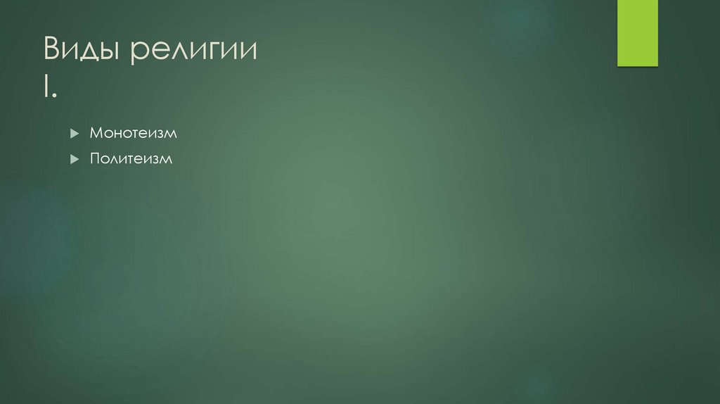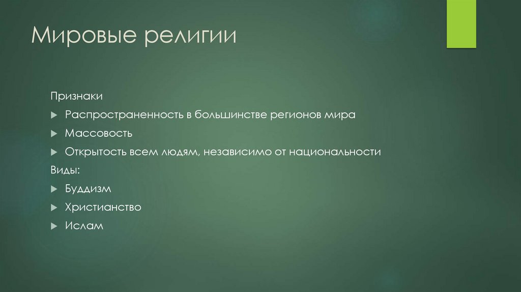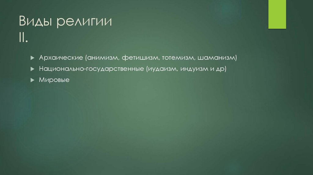 Архаические (анимизм, фетишизм, тотемизм, шаманизм)Национально-государственные (иудаизм, индуизм и др)